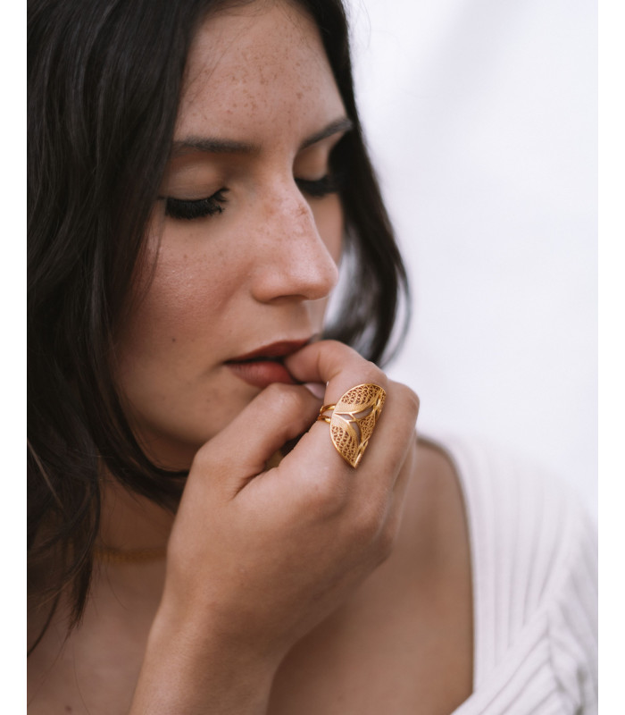 Anel em prata dourada com zircónias brancas de corte retangular, que trazem brilho e sofisticação. O design elegante combina a riqueza do tom dourado com a transparência das pedras, criando uma peça versátil, ideal para complementar visuais refinados em qualquer ocasião.