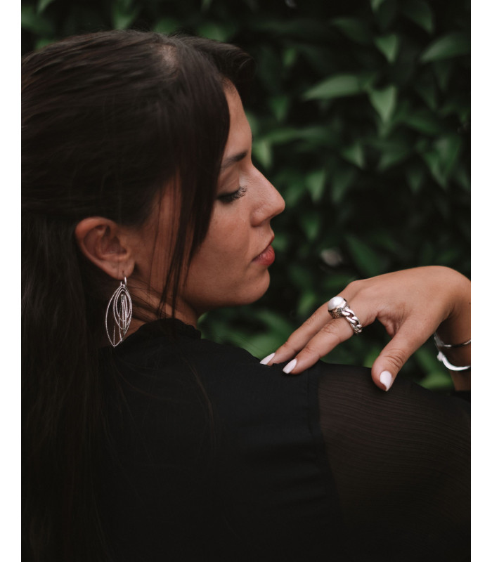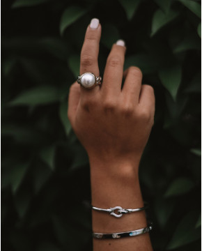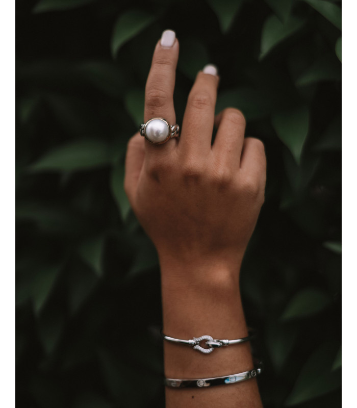 Anel em prata trabalhada com detalhe em ouro 375 e pedra natural de labradorite, contornado com zircónias cintilantes.