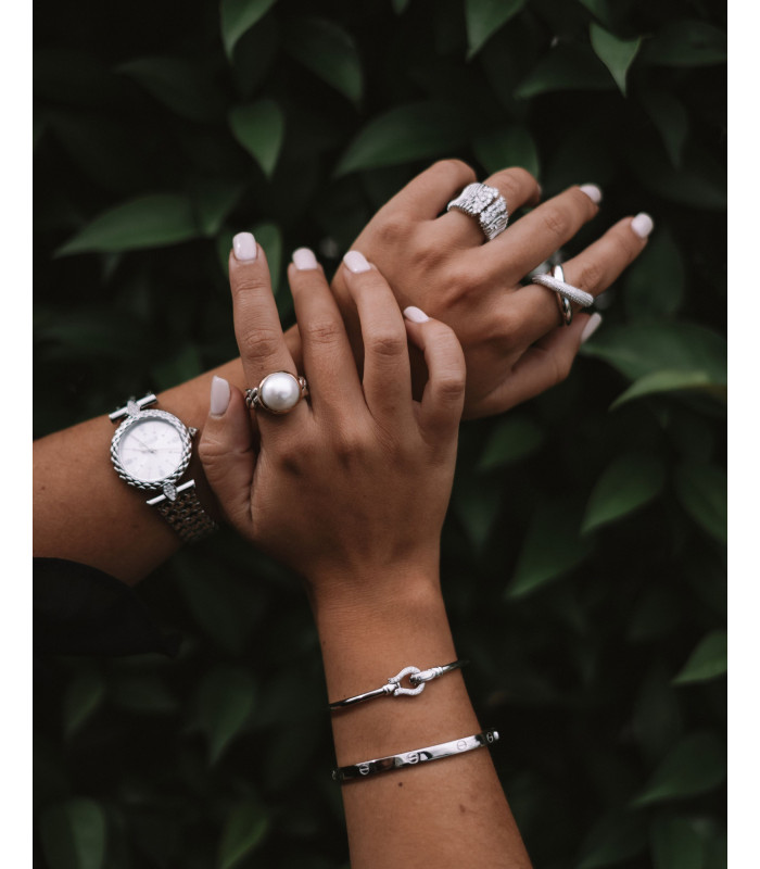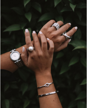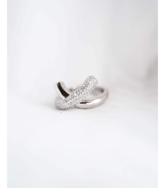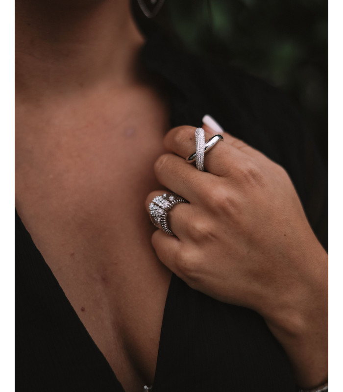 Este anel distingue-se pelo seu design geométrico e pela faixa central rotativa, proporcionando um toque dinâmico e contemporâneo. Confecionado em prata com detalhes em ouro, e enriquecido com zircónias, que acrescentam brilho e sofisticação a cada movimento.