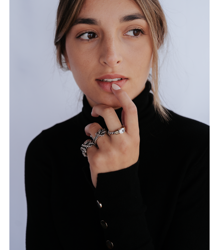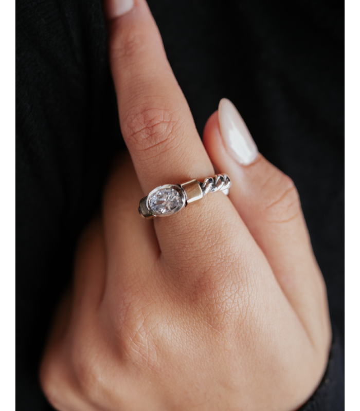 Colar moderno em prata com um elegante toque de ouro e uma pedra de fluorite retangular. A peça apresenta um design minimalista, com uma corrente de prata robusta, destacando um pingente que combina um disco texturizado em ouro e uma fluorite translúcida. Ideal para quem procura uma peça única e sofisticada.