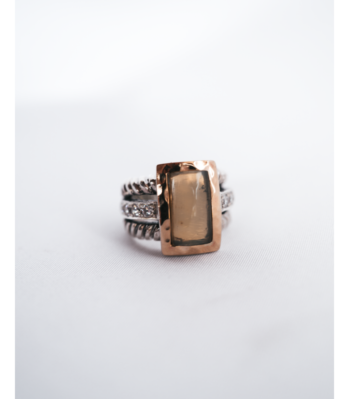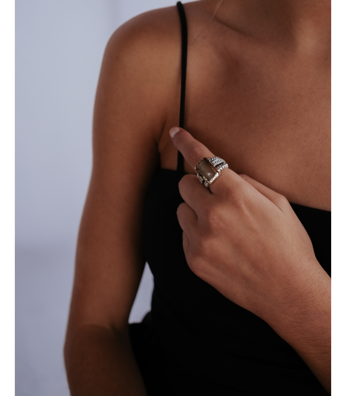 Anel luxuoso em prata e ouro, com design imponente e uma pedra central retangular que adiciona sofisticação e exclusividade à peça.