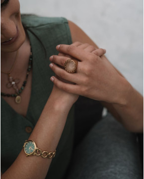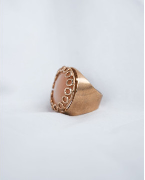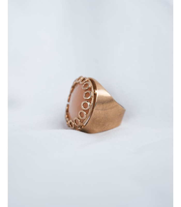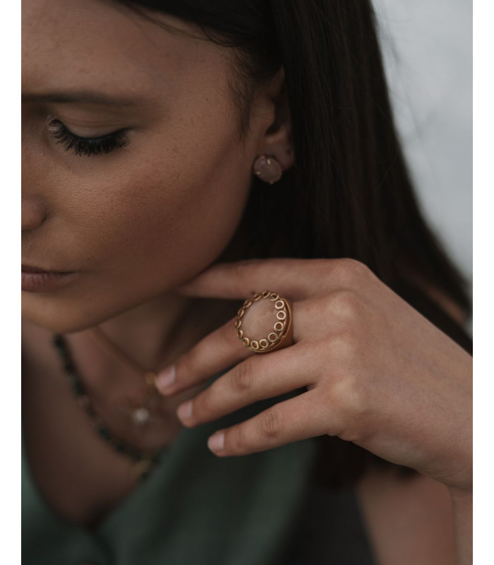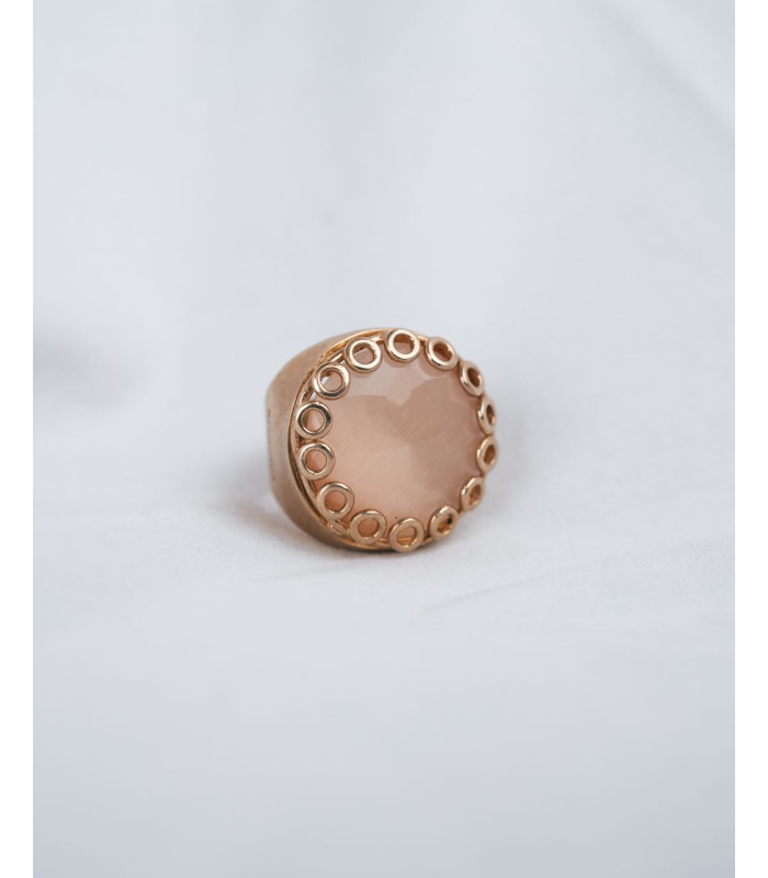 O anel “NOAA” destaca-se pelo seu design arrojado e presença marcante. Com uma pedra hidrotermal central em tom nude rosado e acabamento facetado, é envolvido por um aro decorativo elegante que acrescenta textura e originalidade. Esta peça conjuga robustez com um brilho contemporâneo.