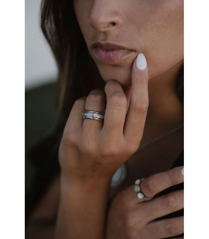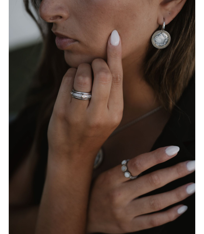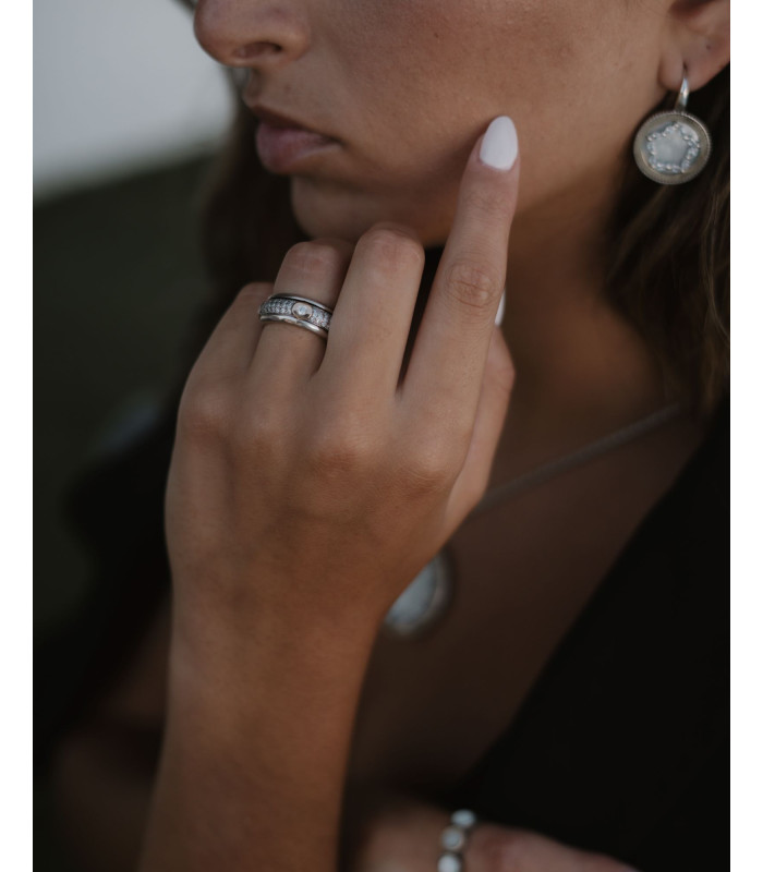 Anel em prata com detalhe em ouro é uma peça singular com toque personalizado — a pedra azul foi escolhida para refletir a calma do mar e a liberdade do céu.