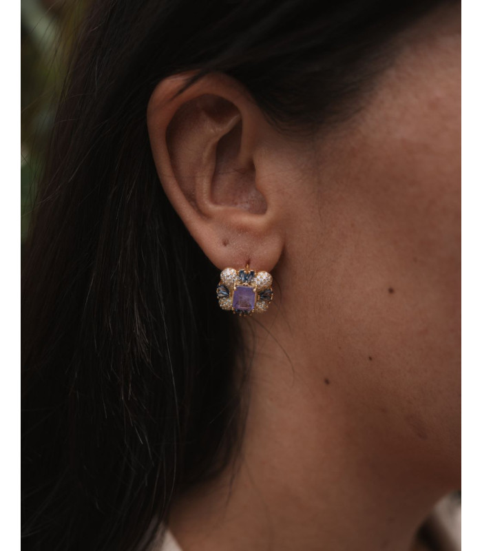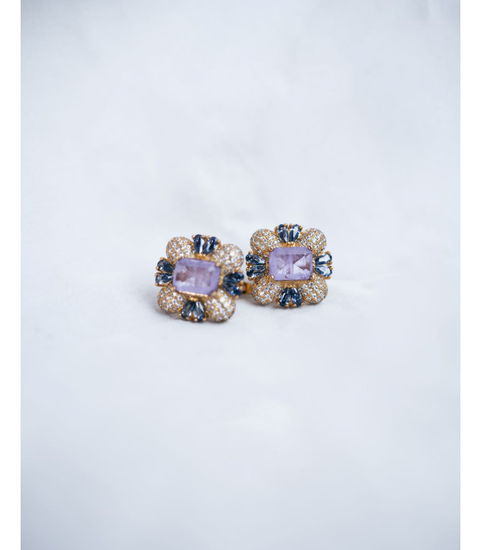 Com um design clássico e encantador, os Brincos Quadrados Violeta são feitos em prata dourada com acabamento refinado. A peça destaca uma pedra central em tom violeta suave, rodeada por zircónias e detalhes lapidados que realçam o brilho e a sofisticação.