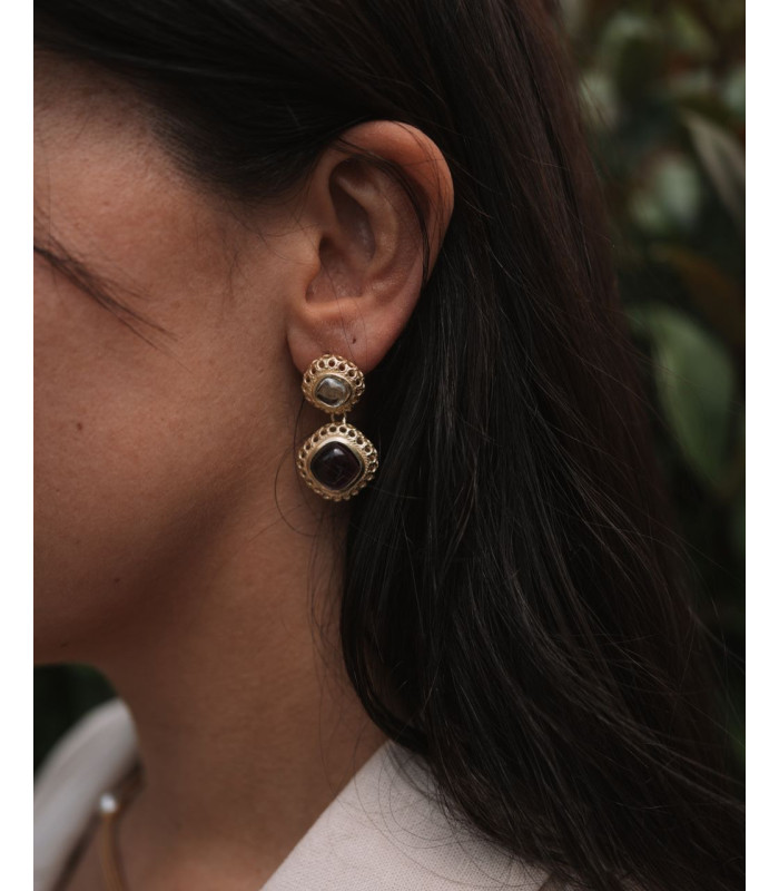 Brincos elegantes em prata dourada, trabalhados com detalhes rendilhados e adornados com zircónias.