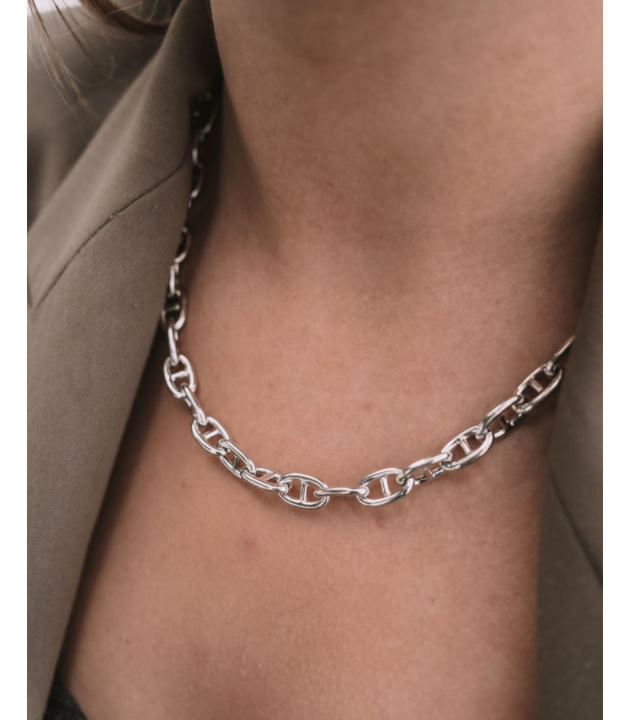 Este colar de prata apresenta um design de elos grossos e interligados, oferecendo um visual moderno e robusto. Elegante e versátil, é perfeito para adicionar um toque de estilo a qualquer look, seja casual ou mais formal.