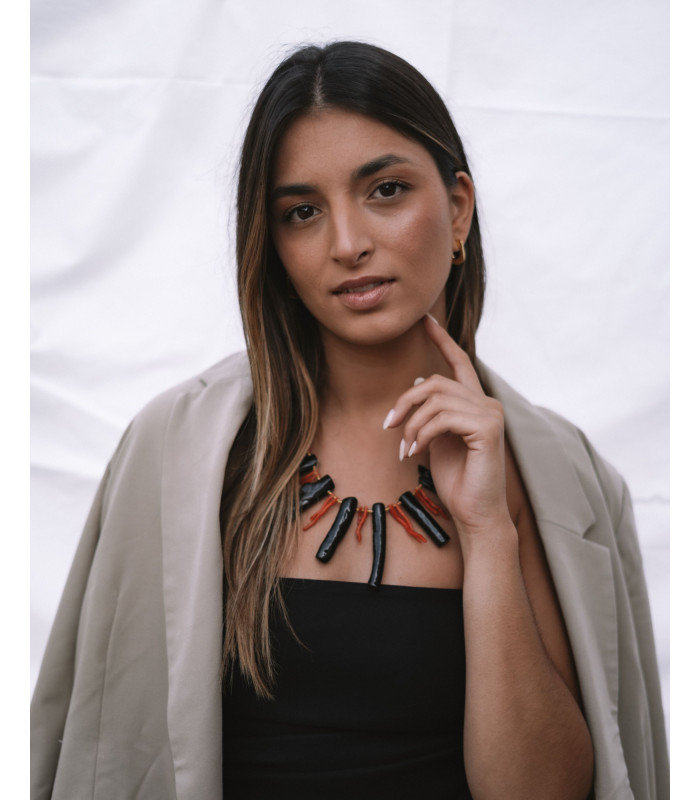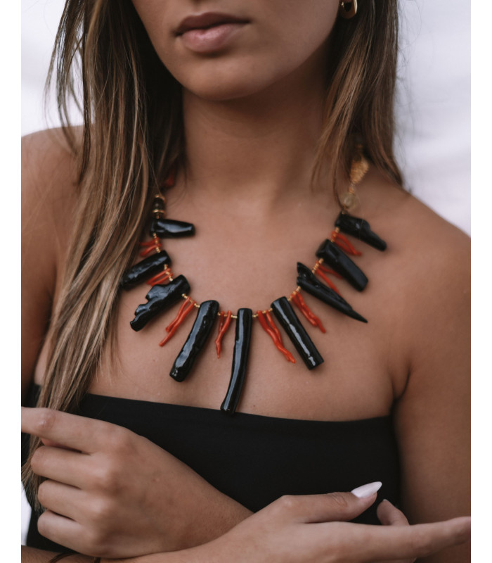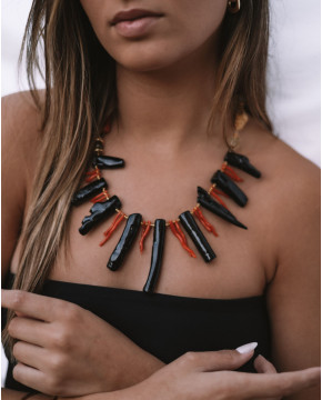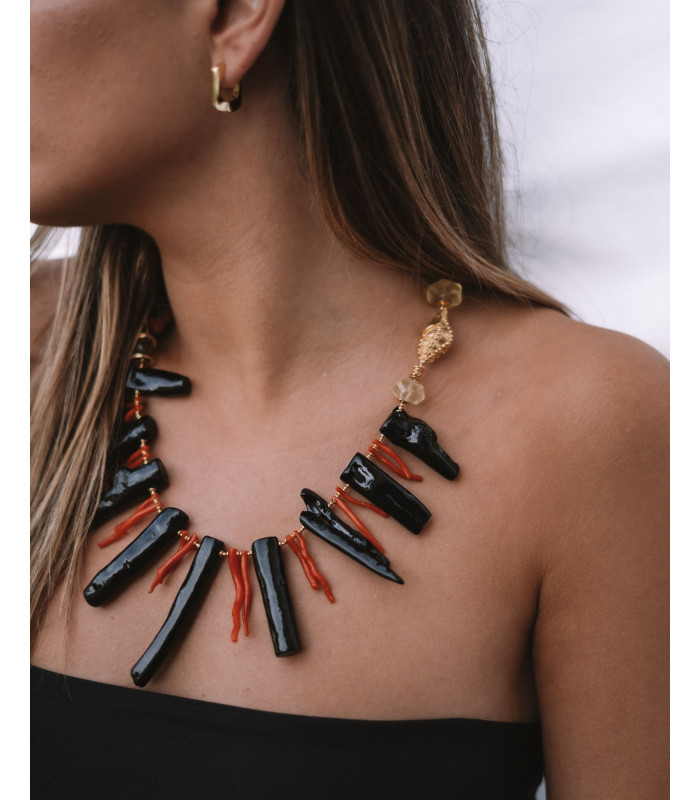 Este colar de prata dourada destaca-se pelo seu design autêntico e ousado. Com pedras de coral, quartzo e ágata, criam um contraste marcante e sofisticado. Ideal para quem procura uma peça exclusiva e cheia de personalidade.