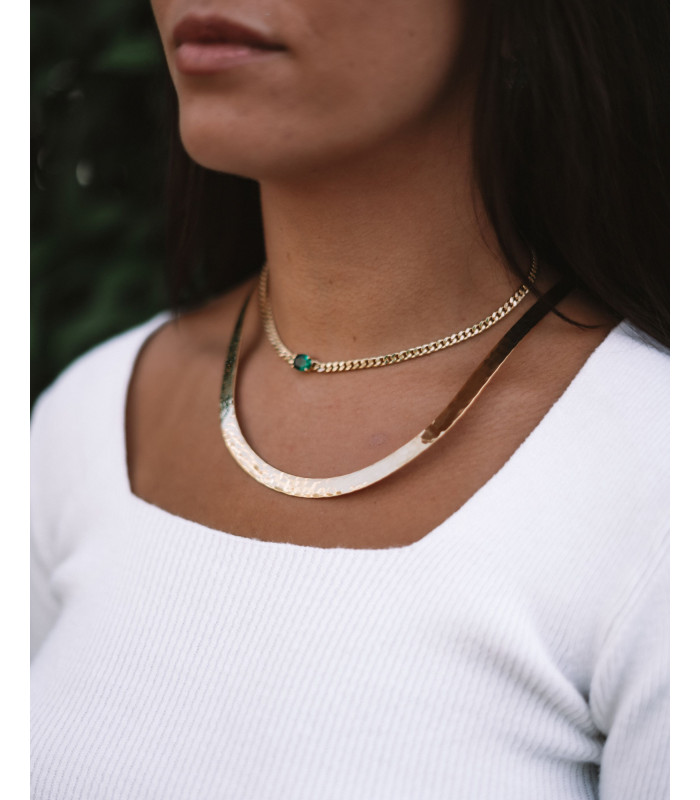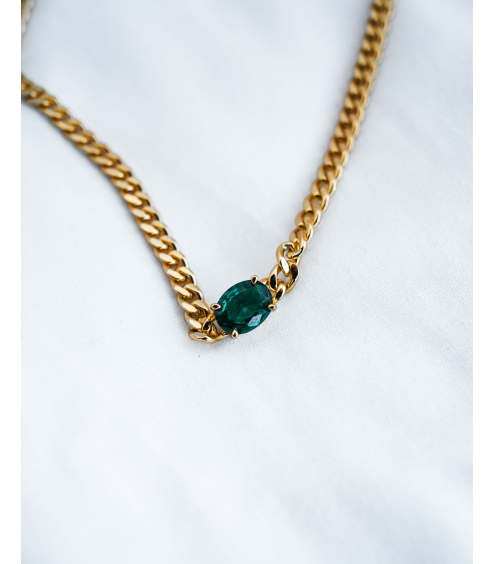 O Colar com corrente barbada oval e pendente verde é uma peça imponente, que adiciona sofisticação e elegância ao seu visual. Com o seu design robusto e marcante, este colar é perfeito para quem procura destacar-se com estilo e personalidade em qualquer ocasião.