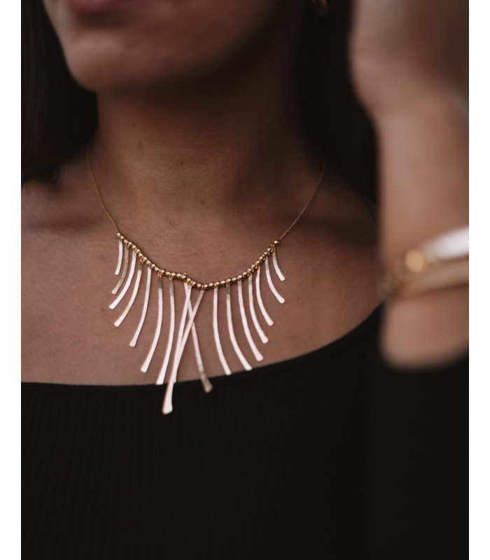 Este colar em prata dourada combina a sofisticação das pérolas com a elegância de um design moderno e delicado. Uma peça versátil e intemporal, perfeita para complementar qualquer look com um toque de luxo discreto.