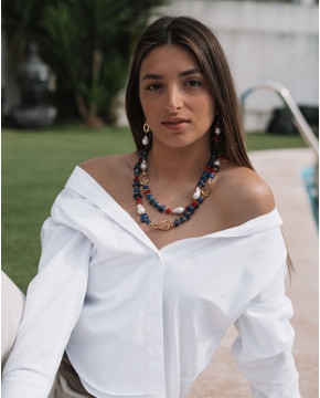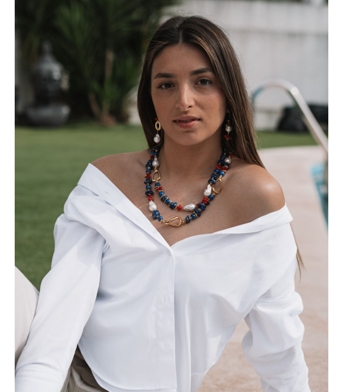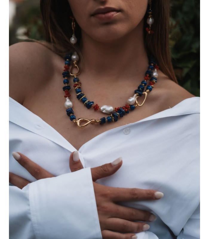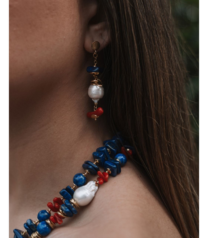 Brincos assimétricos em prata dourada, adornados com coral vermelho, lápis-lazúli e pérolas barrocas. Uma composição ousada que combina elegância com um toque artístico e contemporâneo.