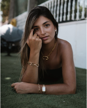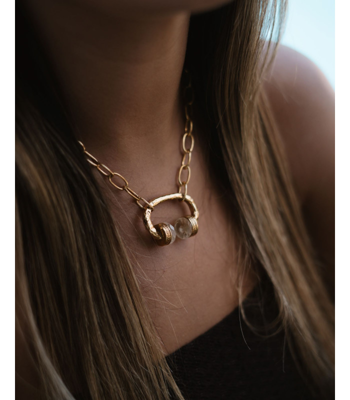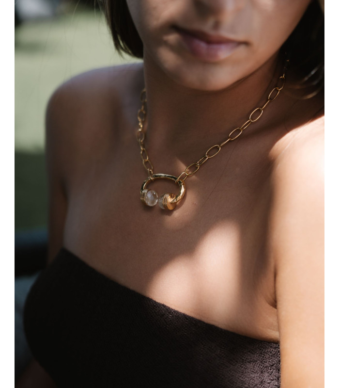 Colar sofisticado em prata dourada, com corrente de elos e pendente exclusivo, adornado com duas pedras citrino que irradiam luz e elegância.