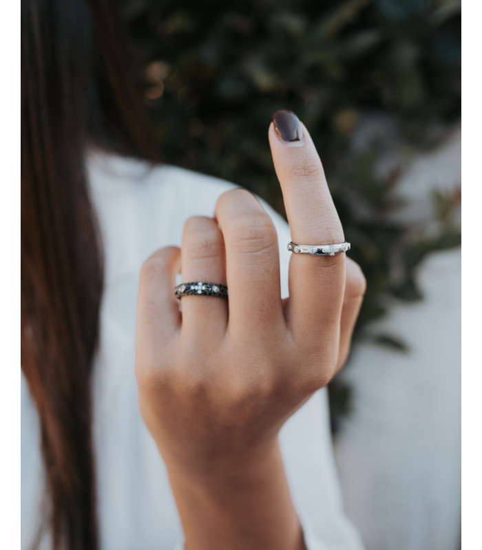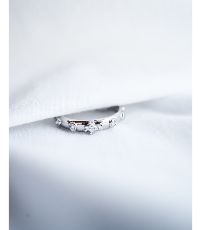 Um anel de prata delicadamente ornamentado com uma dezena de zircónias. Uma expressão de fé e beleza que eleva cada momento com luz e significado.