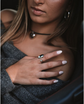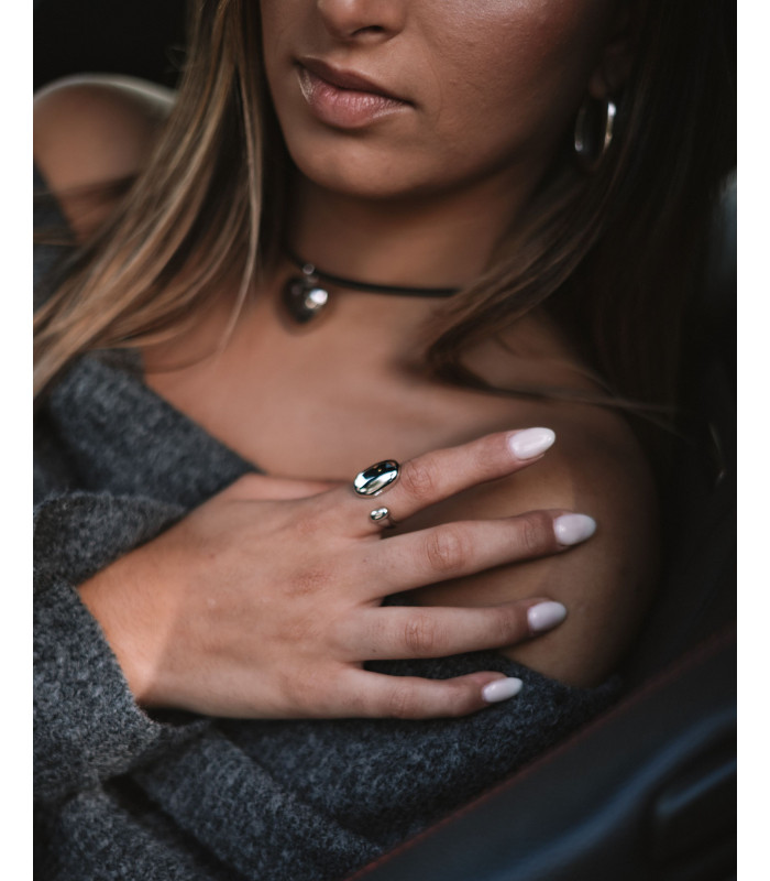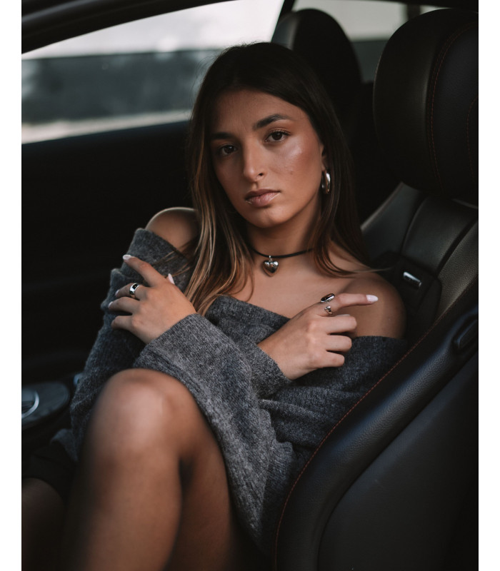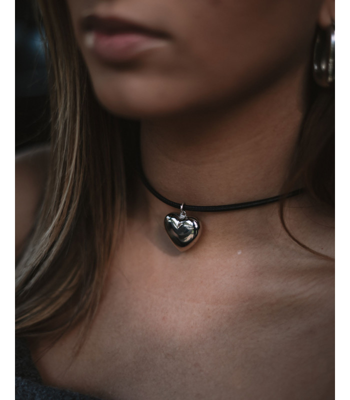 Colar em couro preto com pendente de coração bojudo em prata, estilo moderno e minimalista. Ideal para um toque elegante e romântico.