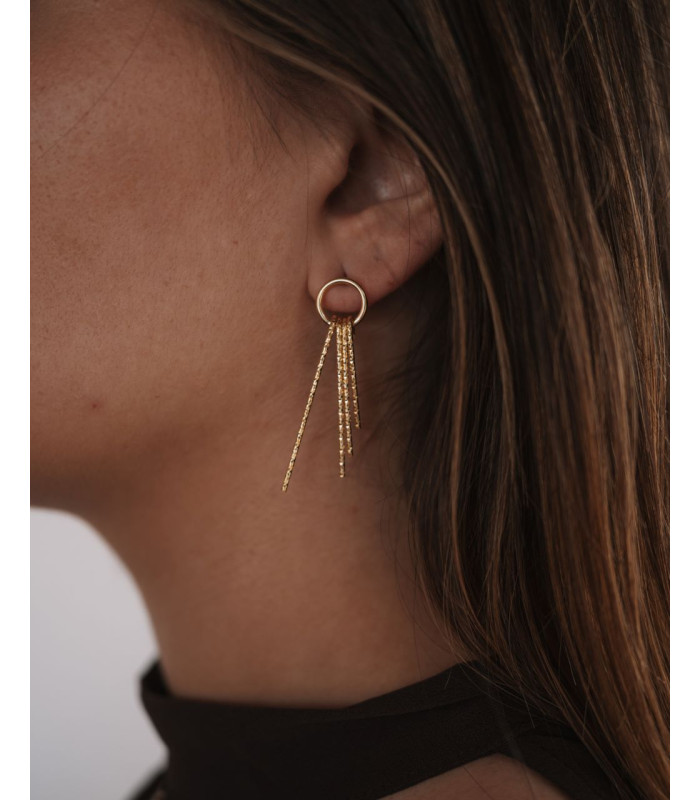 Brincos em prata dourada, compostos por um aro central e múltiplas franjas texturadas que criam movimento e brilho com cada gesto.