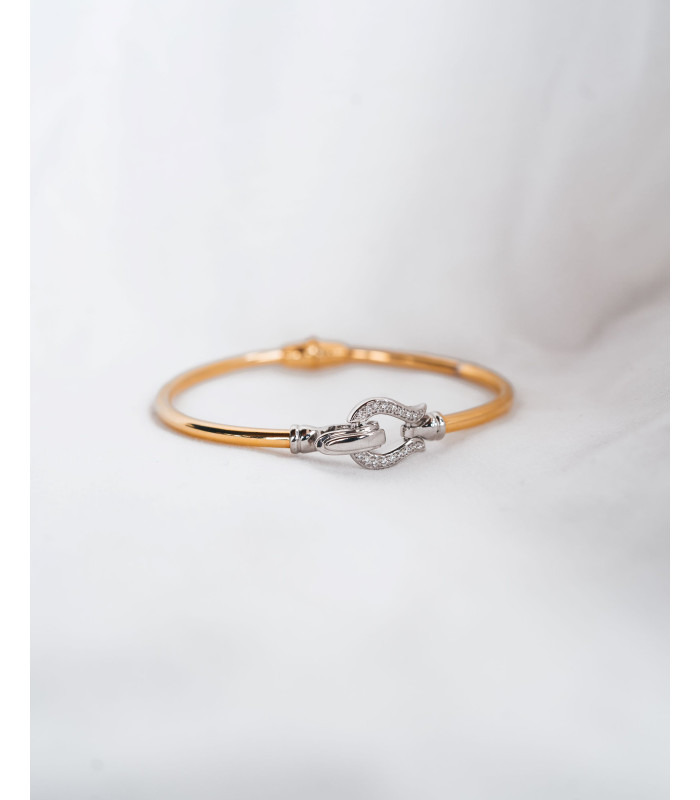 Esta pulseira de prata dourada é uma peça elegante e minimalista que envolve o pulso com sofisticação. Com um design fino e contemporâneo, apresenta uma abertura em forma de "T" que adiciona um toque de originalidade, perfeita para complementar qualquer look.