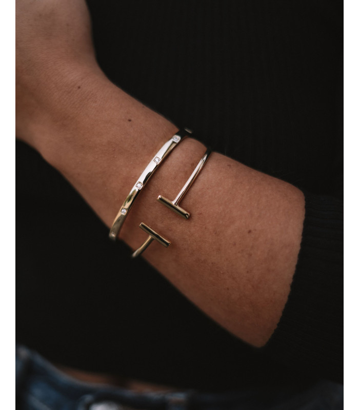 Pulseira de prata dourada rígida e aberta em forma de "T" nas extremidades.