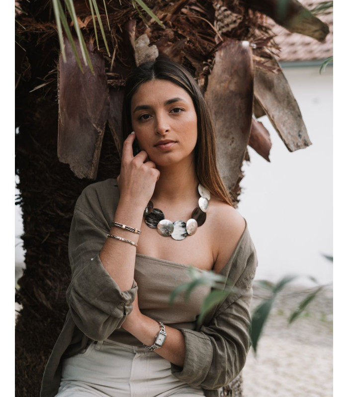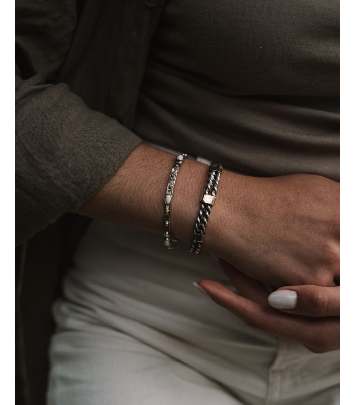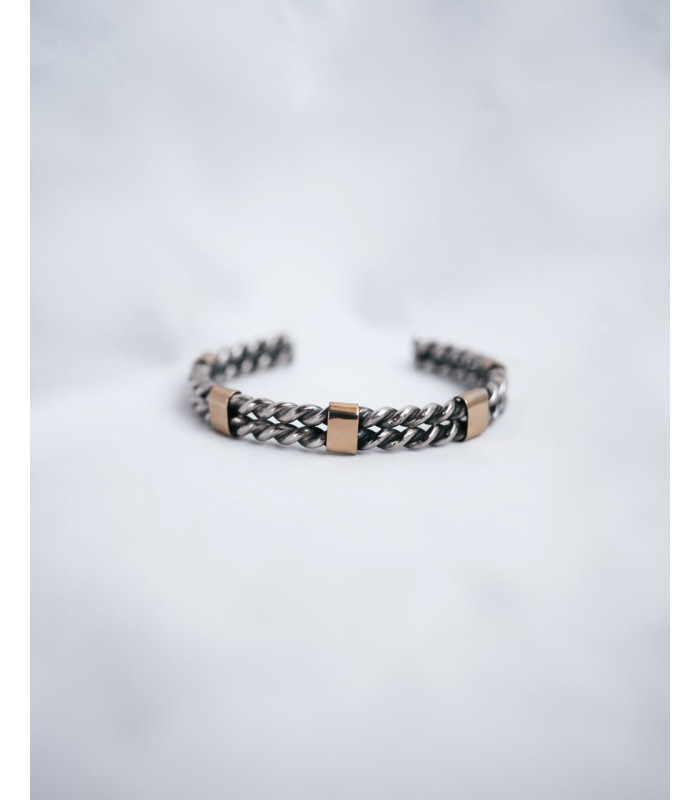Pulseira em prata oxidada com malha torcida e elegantes detalhes em ouro polido, para um visual sofisticado e robusto.