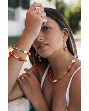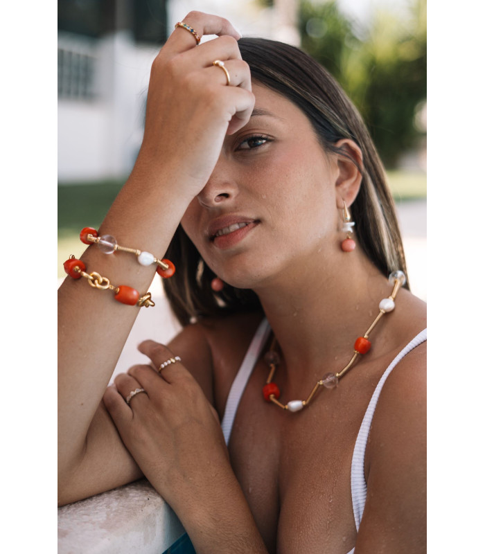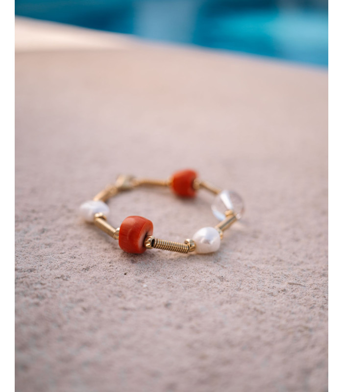 Pulseira em prata dourada com coral, pérola e cristal, cheia de cor e elegância.