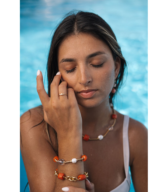 Pulseira em prata dourada com elos robustos e contas de coral natural, unindo sofisticação e cor vibrante.