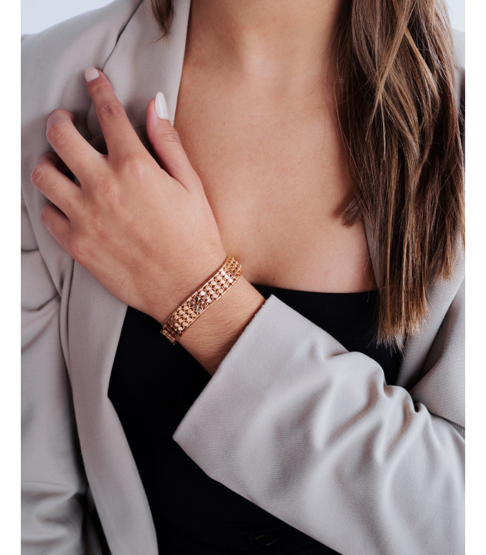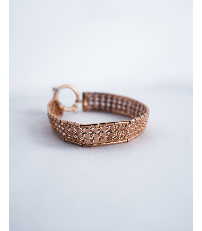 Pulseira em ouro de design sofisticado, com malha trabalhada que combina resistência e elegância.